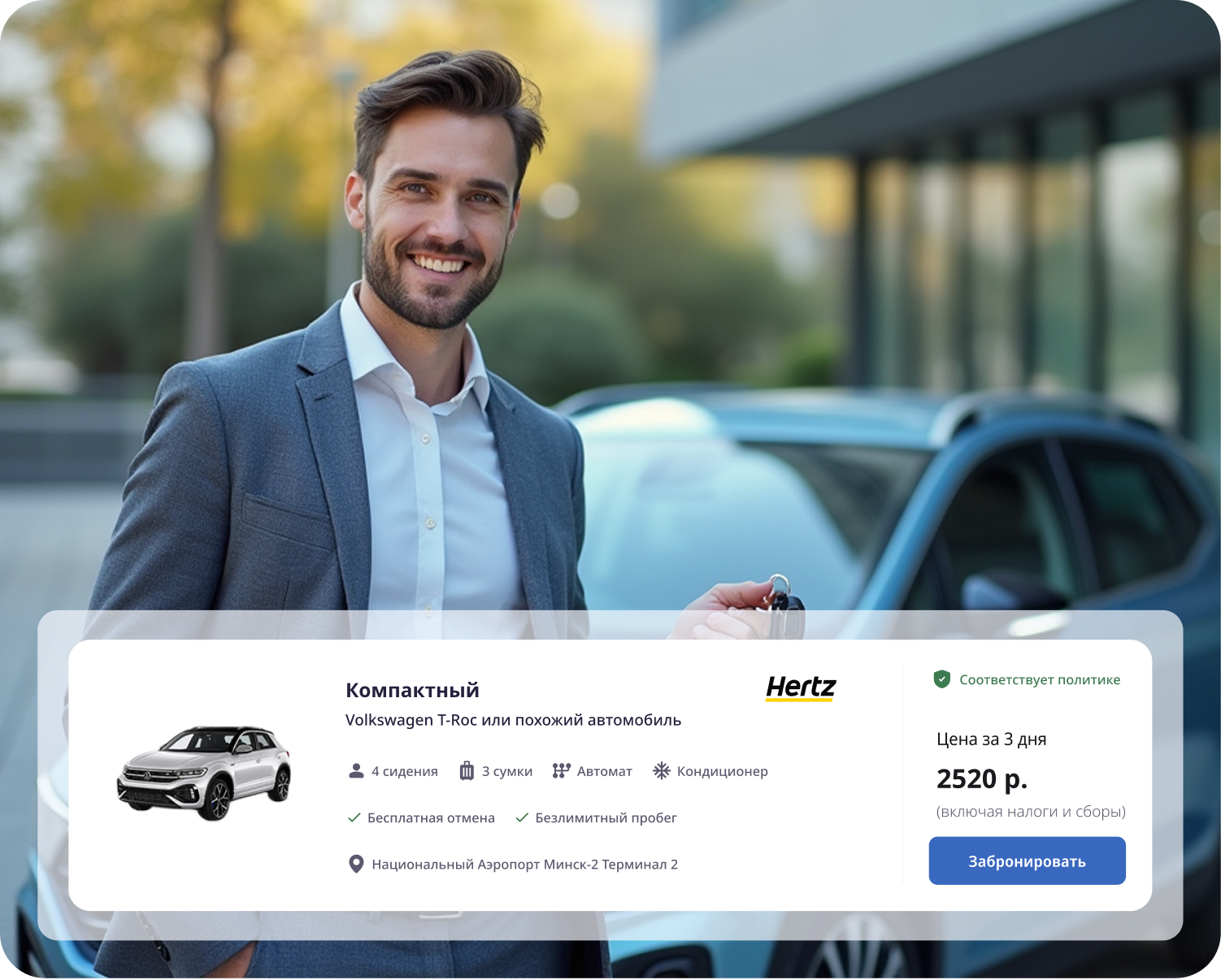 IT-консалтинговая компания с 120 специалистами постоянно командирует сотрудников к клиентам в разных странах. Аренда авто обходилась в 180 000 € ежегодно. Бронирование занимало до 2 часов на каждую поездку, а скрытые сборы (страховки, топливо) увеличивали итоговую стоимость на 20-40%.