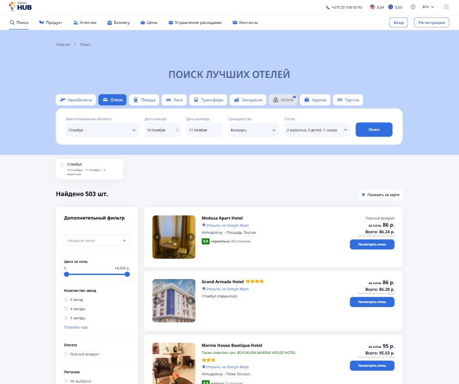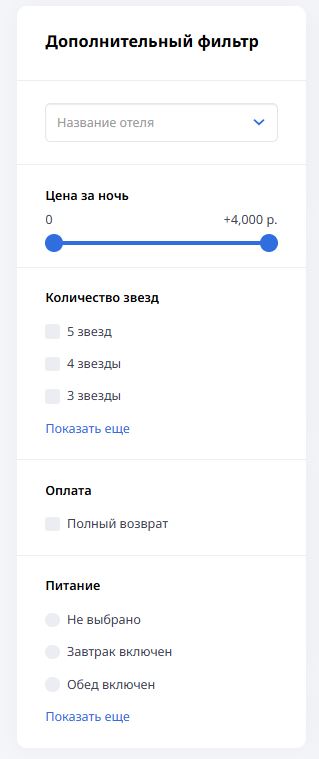 Звёздность, питание, локация, парковка и десятки других фильтров.