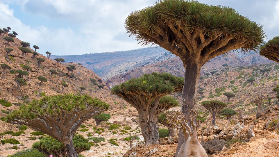 - Драконовое дерево (драцена киноварно-красная) — впечатляющее дерево с кроной, напоминающей огромные зонтики, возвышающейся над Сокотрой. Оно выделяет красную смолу, прозванную кровью дракона.