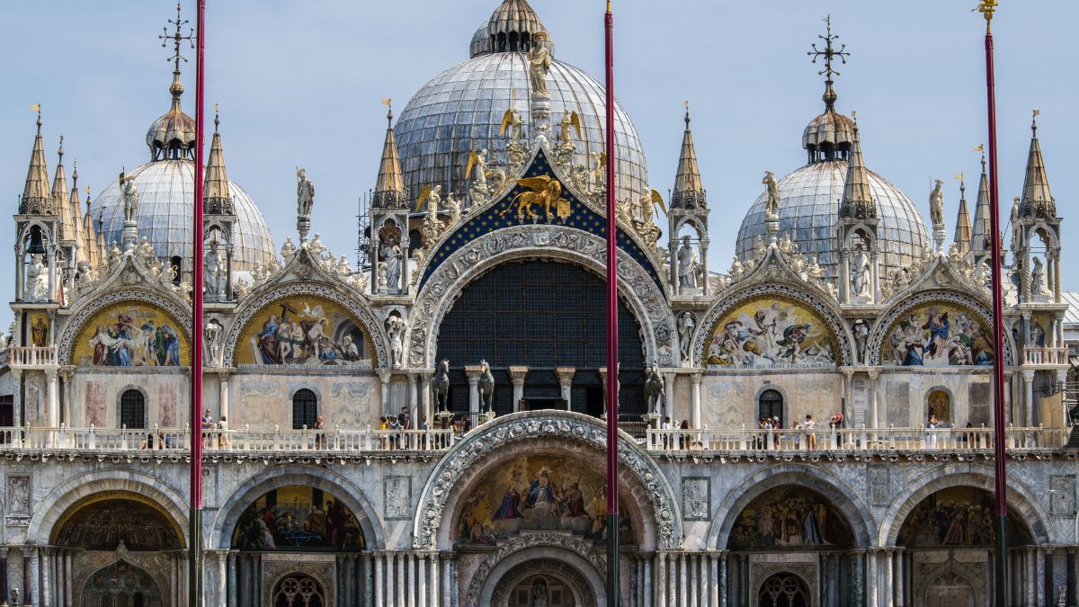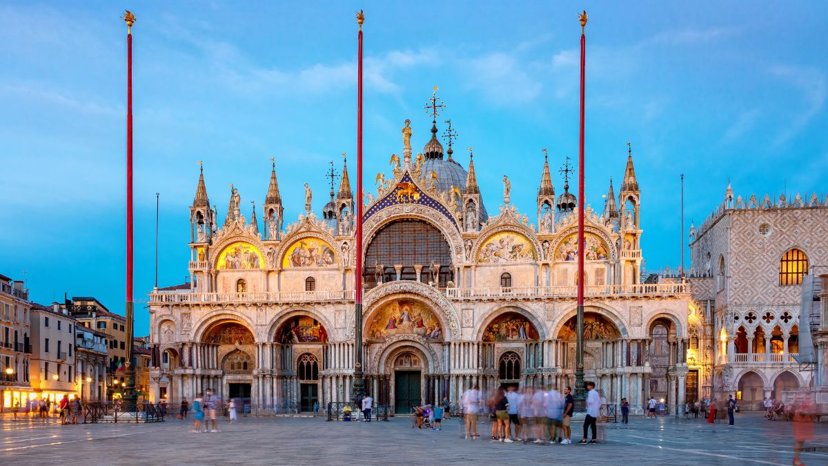 Путешествие по Венеции чаще всего начинается с площади Сан-Марко — исторического центра города, где сосредоточены его главные архитектурные жемчужины. Здесь возвышается базилика Сан-Марко, построенная в византийском стиле. Её фасад украшен золотыми мозаиками, колоннами из драгоценных пород камня и скульптурами, привезёнными из Константинополя. Вход в базилику бесплатный, но за посещение музея, сокровищницы и смотровой площадки на террасе придётся заплатить: от €12 в зависимости от зоны.